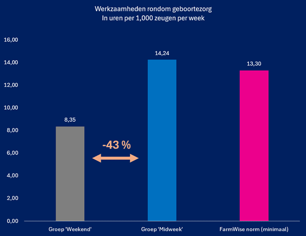 Zo is er een groot verschil in de tijd die wordt besteed aan vaktechnische werkzaamheden tussen de werpgroep ‘Midweek’ en de werpgroep ‘Weekend’. Uit de door FarmWise verzamelde data blijkt dat bij de werpgroep ‘Weekend’ ruim 40% minder tijd wordt besteed aan werkzaamheden rondom geboorte dan in de werpgroep ‘Midweek’. Minder vaktechnische uren heeft een negatieve invloed op het technisch resultaat.